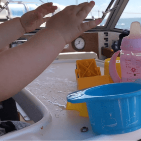 Unsere Matrosin hat mit 3 Jahren schon über Tausend Seemeilen im Kielwasser. Sie jagt gerne Möwen und klettert den Niedergang im Nu hinauf. Hafenmanöver beobachtet sie kritisch aus dem Velositz im Cockpit. Und sobald der Motor brummt, schläft sie.